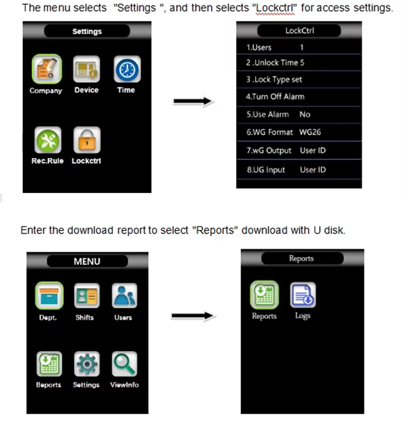 Time attendance Records can only be extracted by plugging a USB and downloading a file from Menu on the Device to USB Flash Drive.The