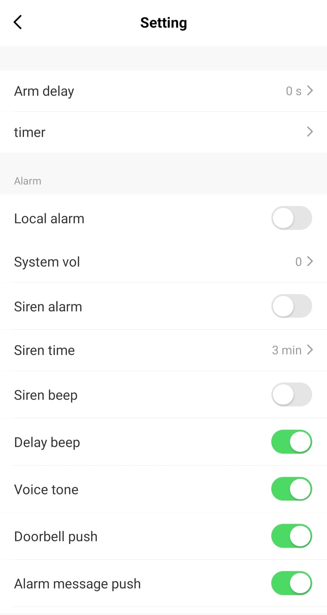 Settings: Arm Delay (0-181s) | Timer (Schedule Arm, Disarm, Home Arm or SOS) | Local Arm | System Volume | Siren Alarm | Siren Time | Siren Beep | Delay Beep | Voice Tone | Doorbell Push | Alarm Message Push | Alarm Delay | Key Beep | Doorbell Volume.